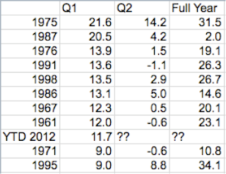 It should be noted that the only year that the S&P wasn't positive after the first quarter was 1987, the year of Black Monday. Also, 1998 was the year of long term capital--the index fell back to flat in September, but made all of its ground back in the 4th quarter.